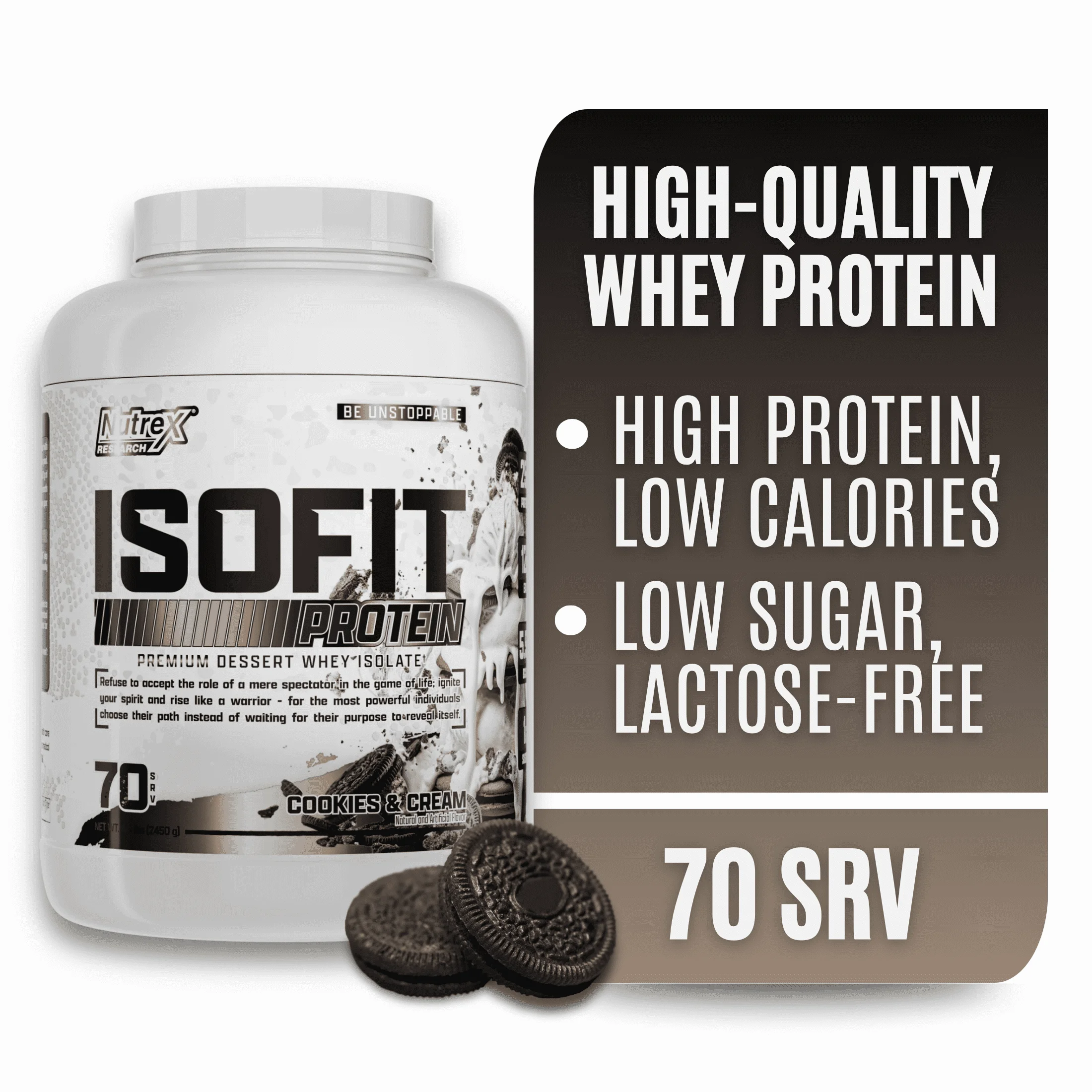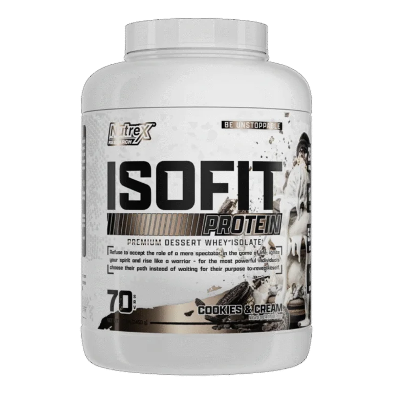 Nutrex Research IsoFit is a high-quality, fast-absorbing whey protein isolate (25g per scoop) designed for muscle recovery and growth. It is lactose-free, gluten-free, and contains 12g of essential amino acids (EAAs) and 5.8g of BCAAs, making it ideal for lean muscle building.